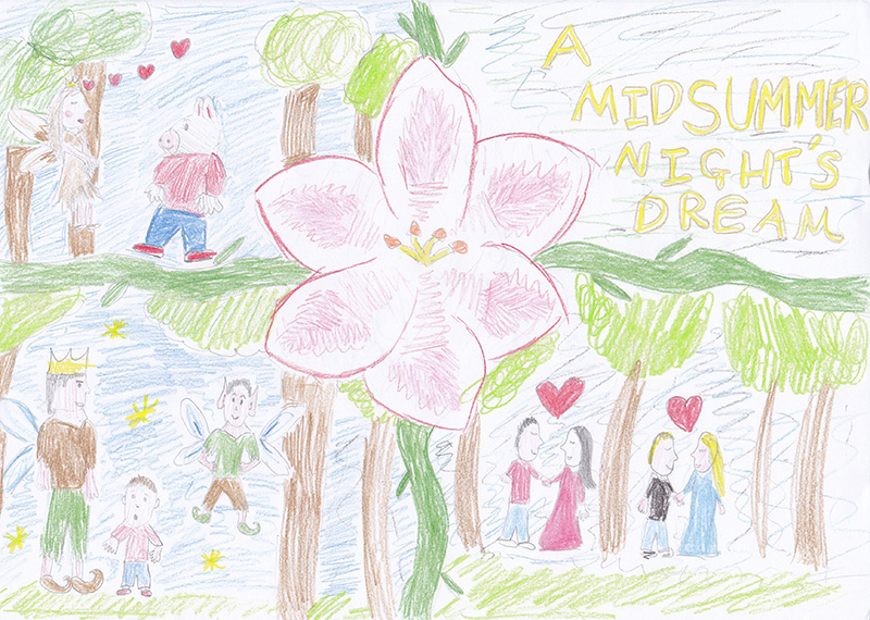 Midnight in the wood outside Athens. You would think it would be quiet, but no, there are grumpy fairies arguing, two couples running after each other and a group of amateur actors trying to rehearse a play. Chaos. And when the queen of the fairies falls in love with a donkey you know something is not quite right. One of Shakespeare's best loved comedies which is still hugely entertaining and great fun four hundred years after he wrote it. (Illustration by Imogen Stokes at Lingfield School, Middlesbrough).