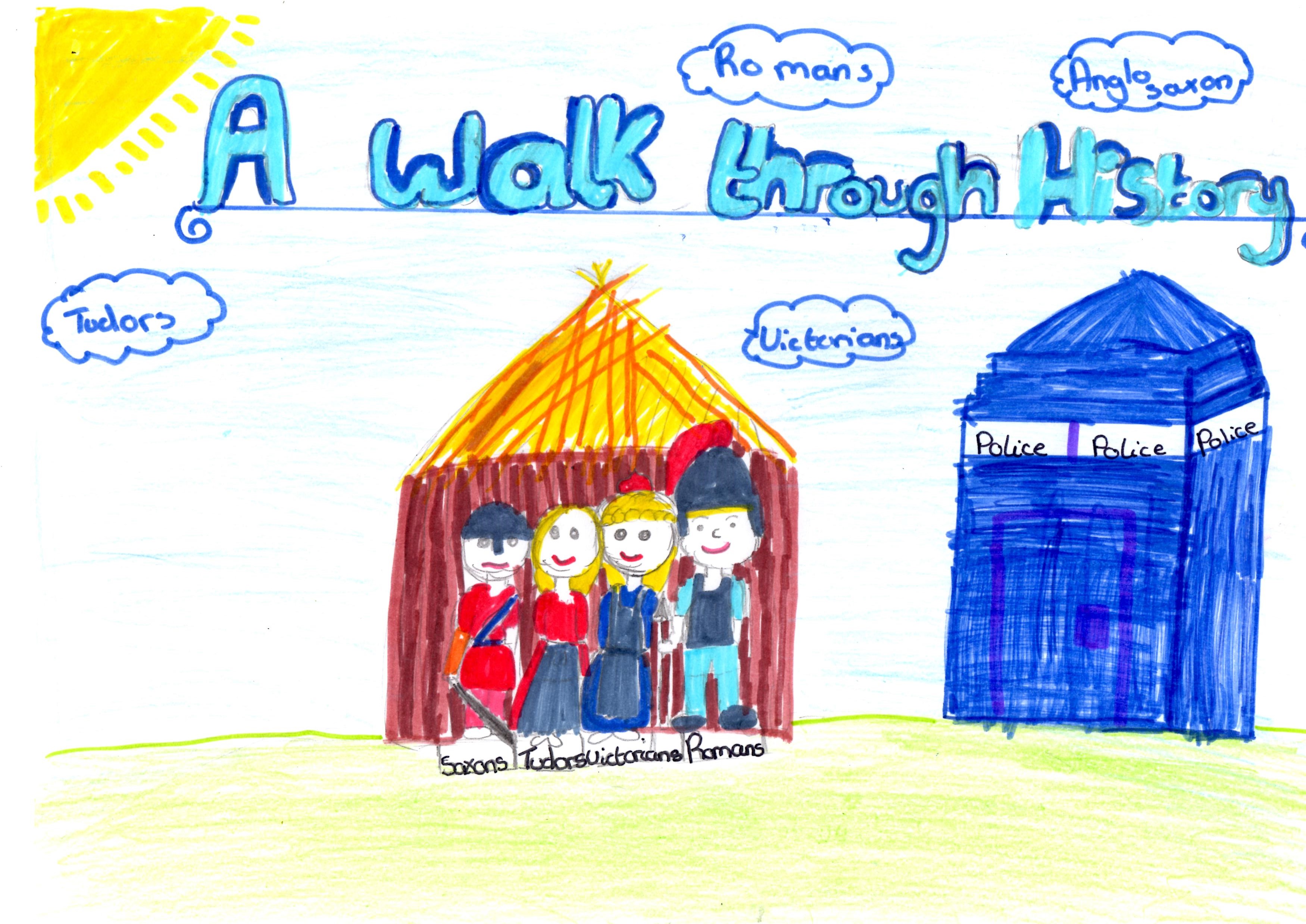Time travel through history. Inspired by Dr Who, we meet the 'Time Guardian' and their assistant. They whisk us back in time to Roman Britain, then on to the Anglo Saxons, the Tudors, Victorian music hall and inventions such as photography, motor cars and the telephone until we find ourselves back in the 21st century. Fun for everyone. (Illustration by Monika Martin at Hill View Primary, Banbury).