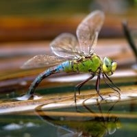 With a lifecycle in 3 stages, after emerging from an egg, the dragonfly spends around 2 years in the water as a nymph, or larva, feeding. It has a hinged jaw with serrated teeth that shoots out to catch its prey. It finally crawls on to dry land, and the exoskeleton cracks open to release its abdomen, then its four wings to become an adult, which will live only a short time, normally just a few weeks.