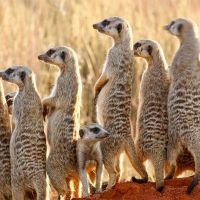 Meerkats are members of the mongoose family and live in dry desert regions at the southernmost tip of Africa. They live in social family groups, called mobs, of up to 30 members led by a dominant breeding male and female. All members take turns to forage for food, look out for predators, or stay behind to take care of the young. Although highly co-operative within their own group, they are highly competitive and aggressive with rival mobs.