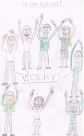 World War 2. Families gather round the wireless to hear war being declared. Husbands and dads go off to war leaving behind children to become evacuees, and wives to become land girls. This play is a popular choice as everyone in the class is fully involved right through to the final 'V for Victory' celebrations. (Illustration by Elouise Weaver, Orgill Primary School, Egremont, Cumbria).