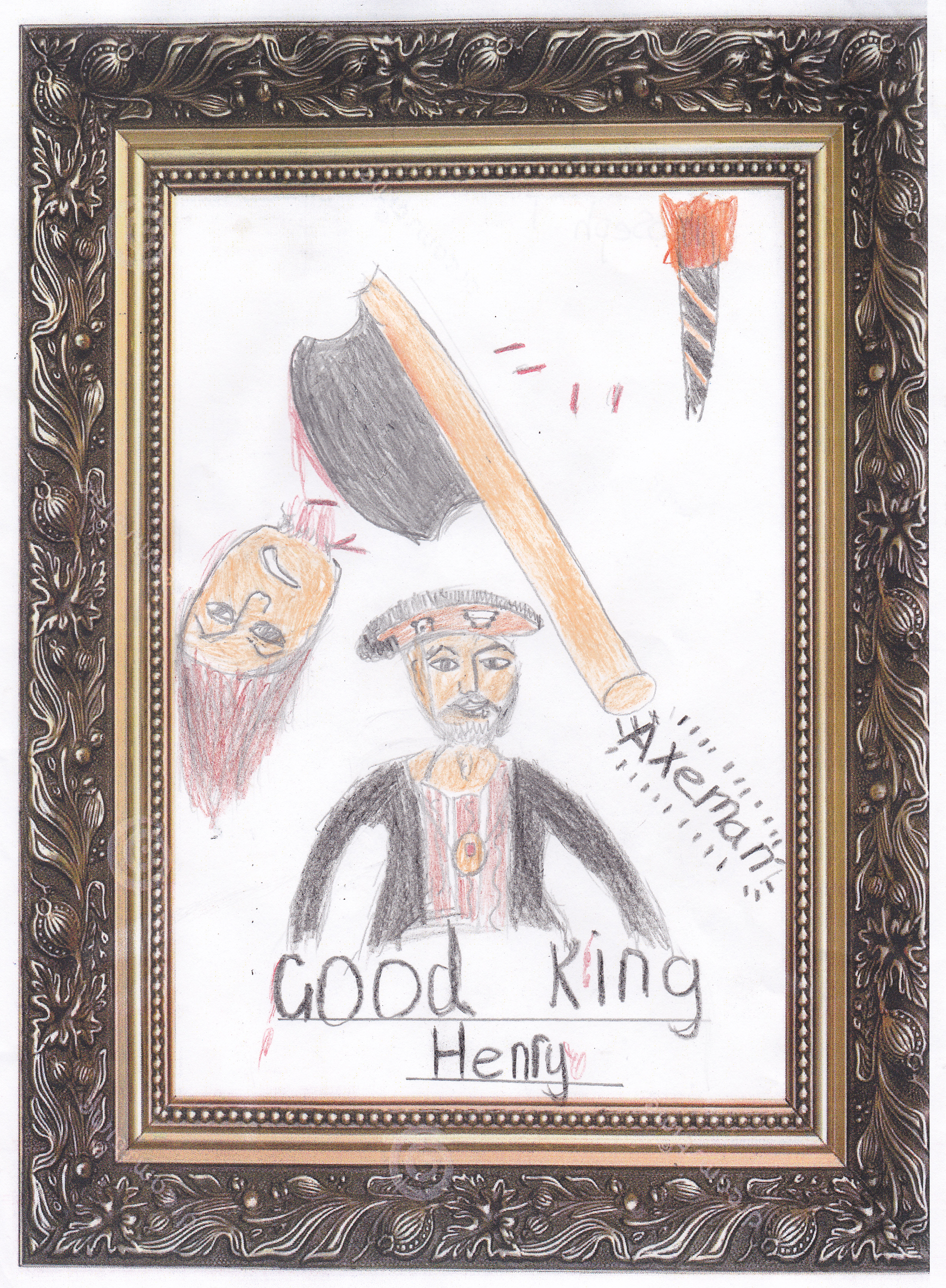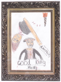Henry VIII is asleep in his room,whilst outside his servants reminisce about his life, wives and general health. We meet all of his wives and hear what the servants truly think about 'good' King Henry. Plenty of action for everyone in the class and great support for curriculum work on the Tudors. (Illustration by Joseph at Whickham Parochial Primary School, Newcastle).